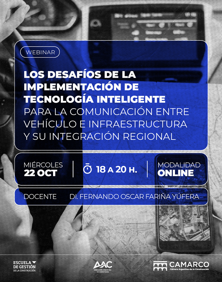 Los invitamos a este nuevo webinar organizado por nuestra Comisión de Movilidad, Transporte y Tecnología junto a la Escuela de Gestión de la Construcción de la CAMARCO donde se abordará la incorporación de tecnologías inteligentes de comunicación entre vehículo e infraestructura (V2I).